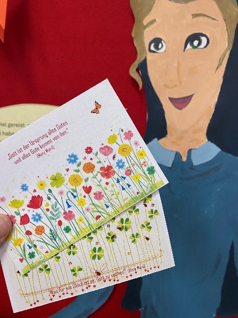 Auf einer Landkarte können die Schülerinnen die weiten Wege von Mary Ward entdecken. Ein dazu passendes Würfelspiel veranschaulicht die Distanzen und sensibilisiert für die Schwierigkeiten, mit denen Mary Ward konfrontiert worden ist. Postkarten mit ihren Sprüchen können mitgenommen, gestaltet und verschickt werden. Außerdem gibt es zur Stärkung Karamellbonbons und Butterkekse. Es ist kaum zu glauben, dass sich ihr Werk auf der ganzen Welt verbreitet hat, obwohl man ihr zu Lebzeiten so viele Steine in den Weg gelegt hat. Ihr Beispiel kann uns ermutigen, nicht aufzugeben und sich für Gutes unermüdlich einzusetzen.
