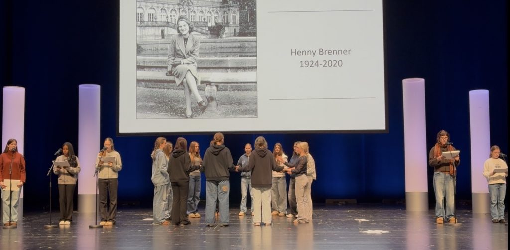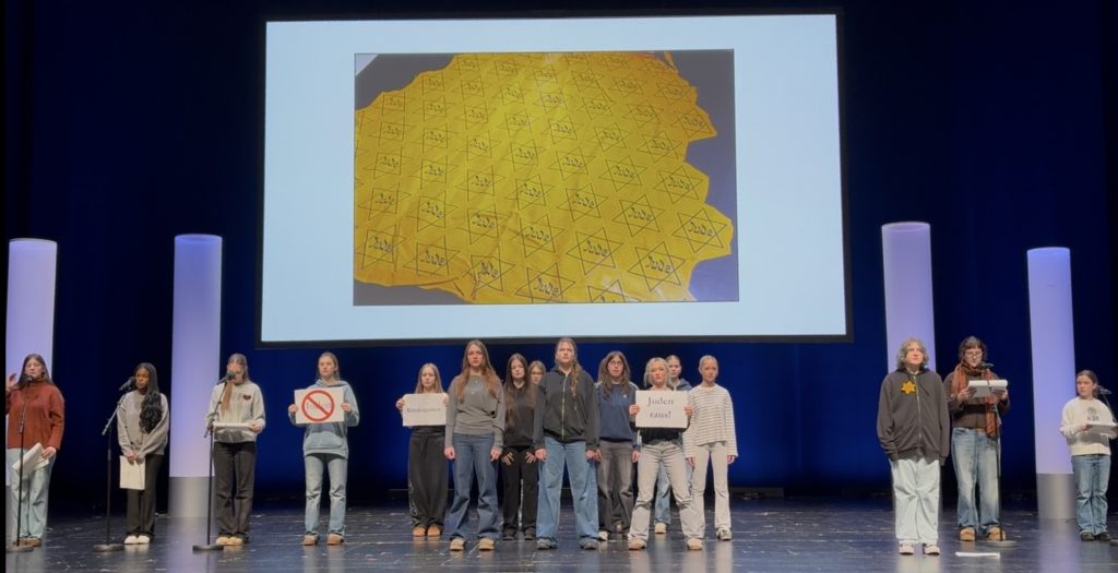Im Rahmen des Deutsch- und Geschichtsunterrichts nahm die Klasse 9c dieses Jahr am Tag der Quellen teil, an dem Münchner Schülerinnen und Schüler aus Dokumenten lesen, die während des Holocaust oder danach verfasst wurden. Nachdem die Klasse das autobiografische Buch „Das Lied ist aus“ der Überlebenden Henny Brenner gelesen hatten, entwickelte die Klasse daraus eine szenische Lesung, die sie auf der Bühne des Münchner Volkstheaters aufführten.