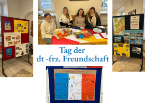 Anlässlich des Tags der Deutsch-Französischen Freundschaft gab es kleine Aktionen in der Pausenhalle. Die Französischschülerinnen der 7. und 8. Klassen hatten Plakate gestaltet. Die waren nötig, um ein kleines Quiz zu beantworten. Wer sich die Mühe gemacht hatte, die richtigen Antworten zu finden, durfte sich einen Aufkleber mit einem „Frankreich“-Motiv aussuchen. Außerdem wurden Macarons verkauft – die insgesamt 120 Stück waren in wenigen Minuten ausverkauft!